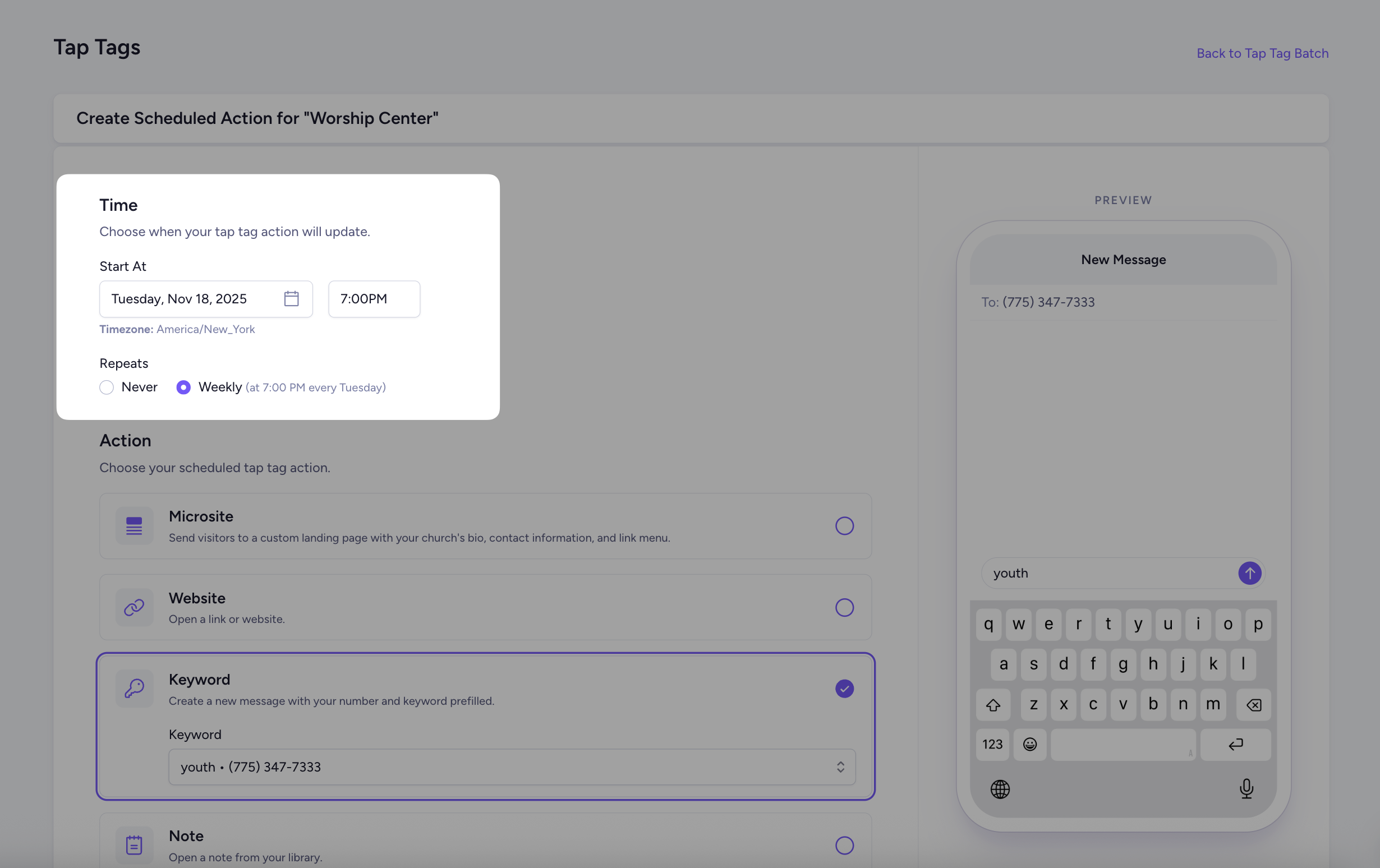 You can now schedule your tap tag's action to update automatically. Choose the date and time you want your action to change, choose if you want it to repeat each week, and select your desired action. That's it!